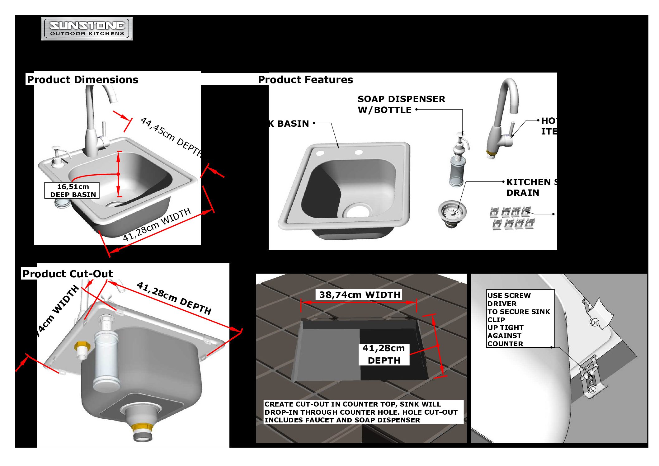 The Sunstone® Drop-In Water Sink is Food-Safe all 304 Stainless Steel. It is made so that it can be installed Horizontally in counter or situated in the Corner of counter, by swapping position with the faucet placed in the corner spot. Includes everything you need to get to started out right, Hot/Cold Chrome Plated Faucet, Matching Soap Dispenser, Kitchen Sized Drain.