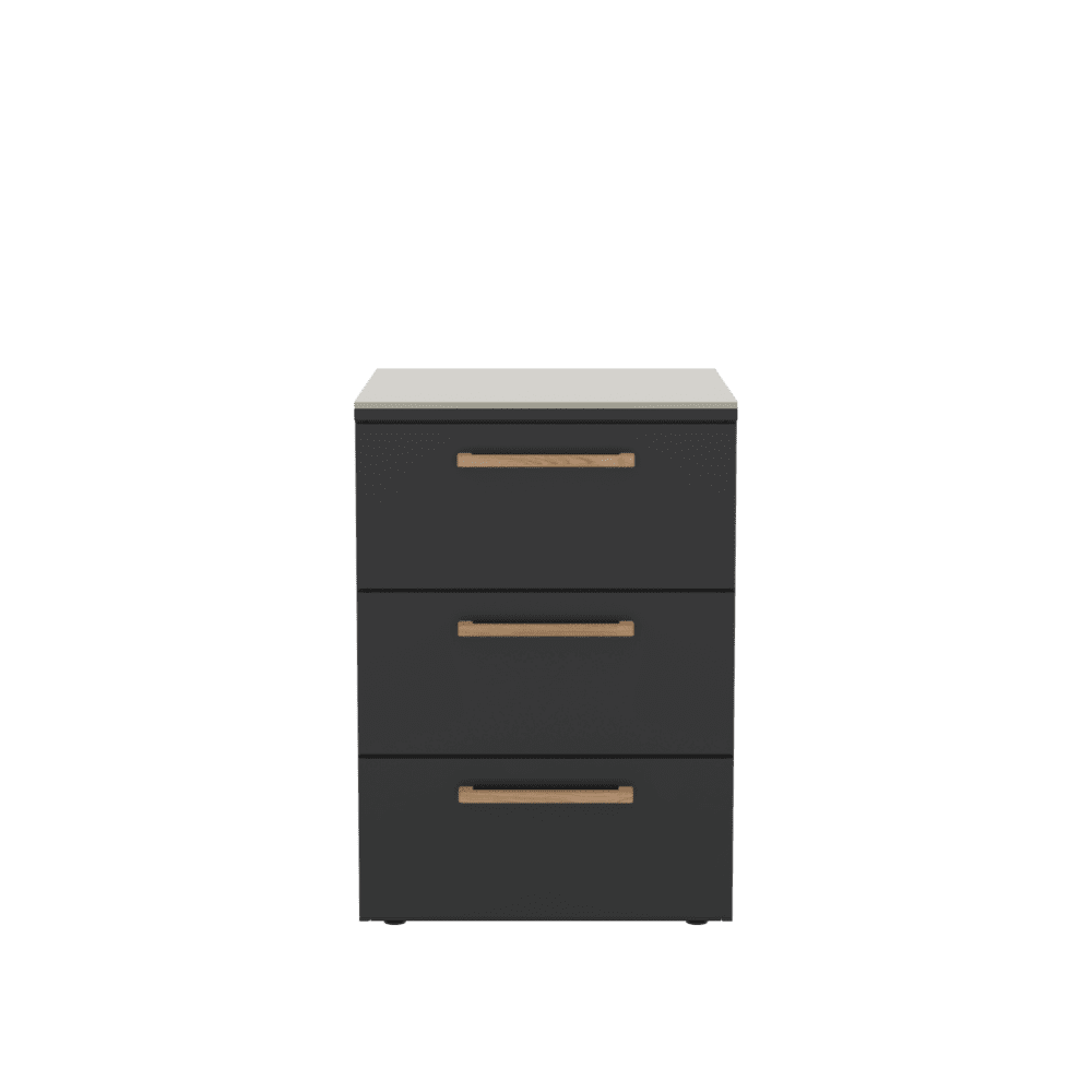 Countertop Material: Neolith Sintered Stone Body Material: Galvanized Steel with Powder Coating Number of Drawers: 3 Soft-Close Slides Accessible Leveling Feet