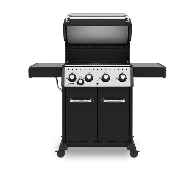 The Broil KingĀ® Crown™490 features 2,865 sq. cm primary cooking surface, cast iron cooking grids, warming rack, stainless steel Flav-R-Wave™ cooking system and an enclosed cabinet base.