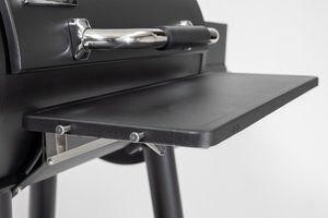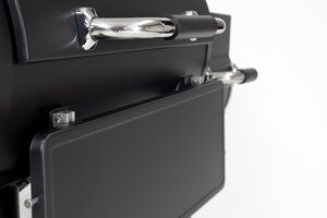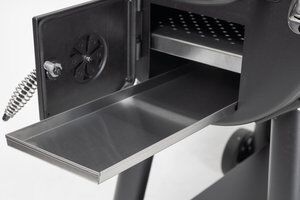 Accu-Temp™ thermometer with chrome bezel 2 doors with heavy-duty stainless steel handles Durable front shelf with integrated tool hooks Removable ash trays in small and large cooking chambers 2 large 8″ / 20cm crack-proof wheels Bottle opener 2mm gauge steel construction High quality high-heat black paint