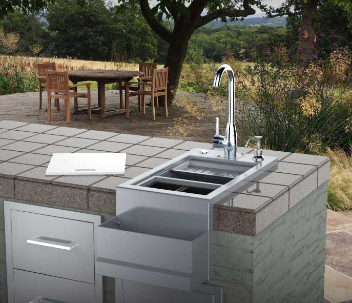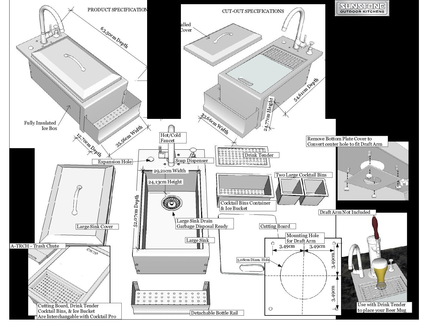 The Sunstone® Pro Cocktail Station is double walled and fully Insulated. It’s the perfect All-In-One Cocktail Drink Mixing Station, with Cut & Clean Cutting Board, Drink Tender, Cocktail Bins, Ice Bucket, to use as Ice Chest and has a detachable Bottle Rail for easy clean up. The whole unit converts to wash-up sink with added Soap Dispenser. This unit is a fully functional beverage station that will elevate your Outdoor entertaining experience and complement your Outdoor Kitchen.