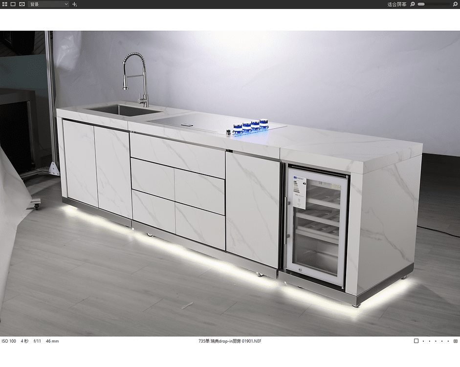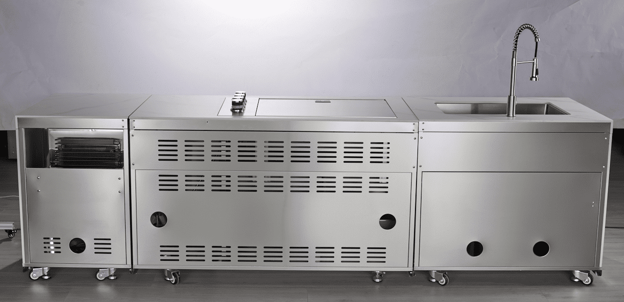 The entire kitchen, including hinges and fittings, is built in 304SS surgical acid-resistant stainless steel, clad with genuine kaolin marble including wonderful natural marbling. The kitchen is delivered in three separate modules on lockable castors and can therefore be easily moved around on, for example, a patio and then assembled together with fittings. The castors can be folded up and adjustable legs lock the kitchen in place. Supplied with a cover in UV and waterproof Oxford fabric.