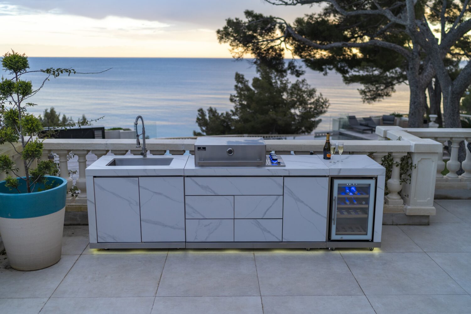 MARMONT Rockbeam sthlm hi-top, outdoor kitchen with gas grill, wine cooler, sink and mixer for hot and cold water. The grill has four burners with a total of 15.6 kW and a grilling surface of 64 x 50 cm. Four flame arresters, two grill grates of 8 mm. carbon steel rods (weighing 3 kg each). The hi-top version has a double-bottomed square hood with temperature gauge and large handle. As accessories, the outdoor kitchen also comes with a planchetta grilling table in SS#304 acid-resistant surgical stainless steel, a cast iron grilling table, excellent for frying hamburgers or vegetables and also a charcoal cradle for the possibility of charcoal grilling without gas. The kitchen has three cabinets and four storage drawers and a pull-out collection container for oil. All with soft close function and push/pull opening. The entire kitchen, including hinges and fittings, is built in 304SS surgical acid-resistant stainless steel clad with genuine kaolin marble with a wonderful natural marbling. Lockable wine cooler 65L, with digital display and programming and teak shelves. Mixer for hot and cold water with extendable hose and sink with strainer. Blue interior lighting in wine cooler and above burner controls and illuminated chassis lower part. The kitchen is delivered in three separate modules on lockable castors and can therefore be easily moved around on, for example, a patio and then assembled with the included fittings. Supplied with a cover in UV and waterproof Oxford fabric.