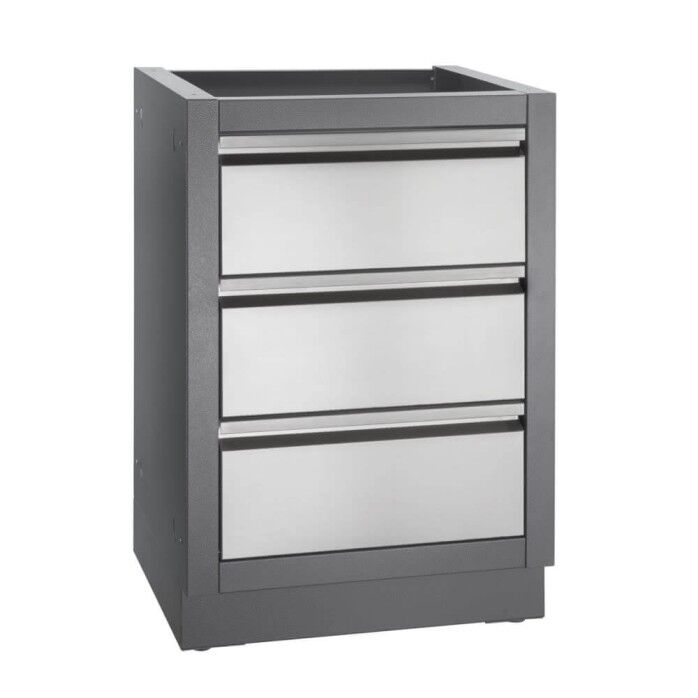 The perfect outdoor kitchen features loads of storage and a durable finish that will stand up to the elements. The OASIS™ Two Drawer Cabinet has stainless steel drawer fronts with an abundance of storage for your Napoleon accessories and grilling spices. This carbon colored, powder coated, galvanneal cabinet features increased durability from the two-coat pebbling, finishing system. Installation is a breeze with knockouts for gas and electrical. Levelling feet ensure a balanced surface, even if your patio isn’t perfectly level. Add this cabinet to the perfect outdoor kitchen OASIS™, along with your choice of grill head and under grill cabinet. The top drawer is false, so it’s ideal for drop-in side burner or small sink to be installed above it. *Countertop not included.