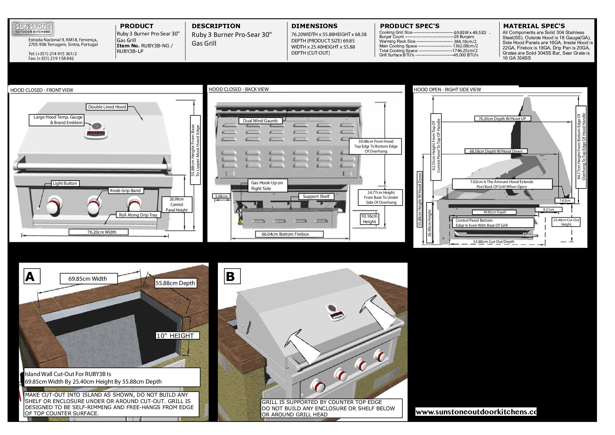 The Sunstone® 3 Burner RUBY series Gas Grill is a powerful grilling unit as well as a unique design piece. Built completely with professional grade 304 Stainless Steel, also for the I-Burners with a minimal BTU output of 45,000, and integrated Flame-Thrower Ignition in ALL burner positions. This grill is seriously powerful and full packed with eye catching features.