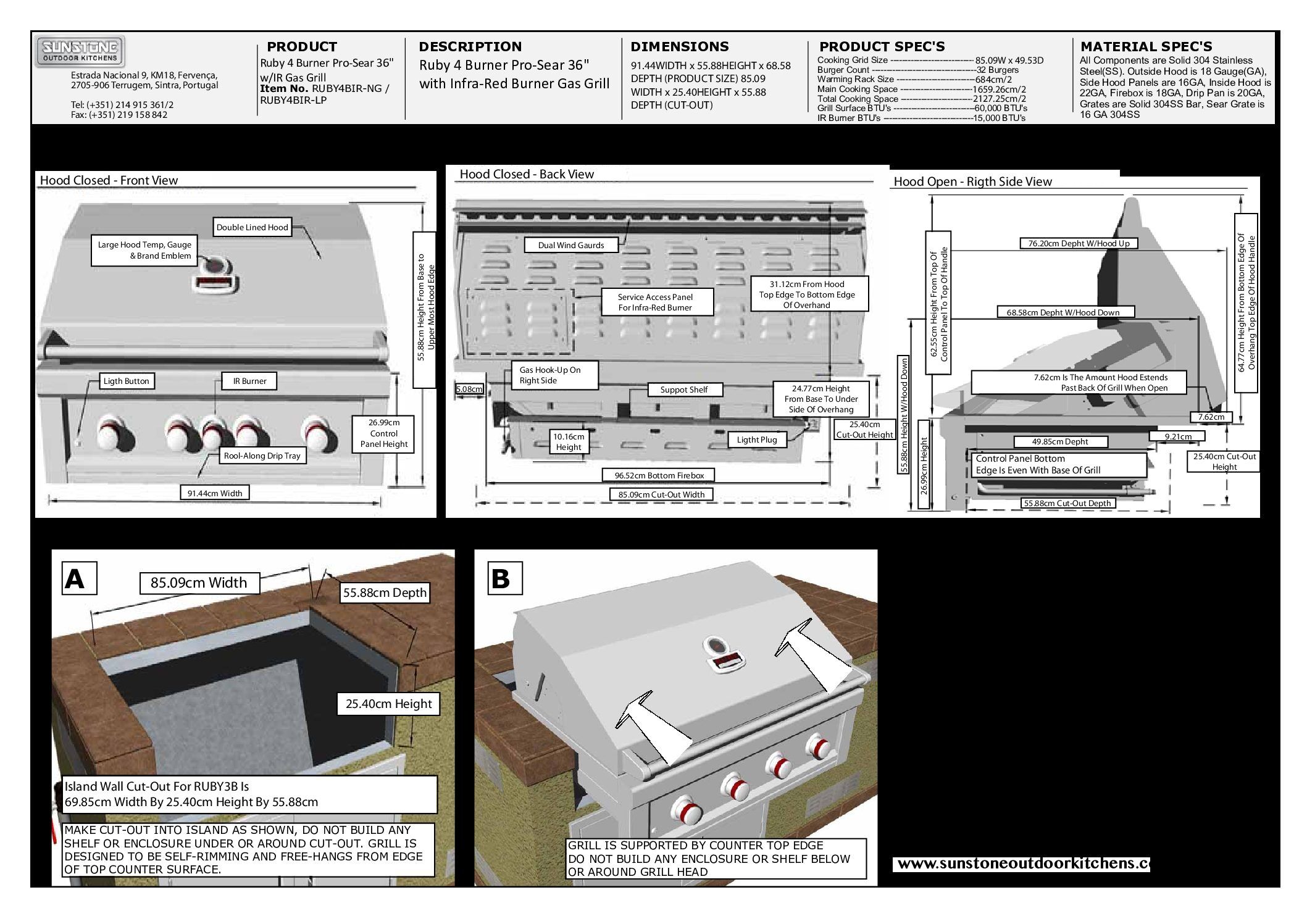 The Sunstone® 4 Burner RUBY series Gas Grill is a powerful grilling unit as well as a unique design piece. Built completely with professional grade 304 Stainless Steel, also for the I-Burners with a minimal BTU output of 60,000, and an additional 15,000 BTU Extra-Wide Rotisserie Back Burner and integrated Flame-Thrower Ignition in ALL burner positions. This grill is seriously powerful and full packed with eye catching features.
